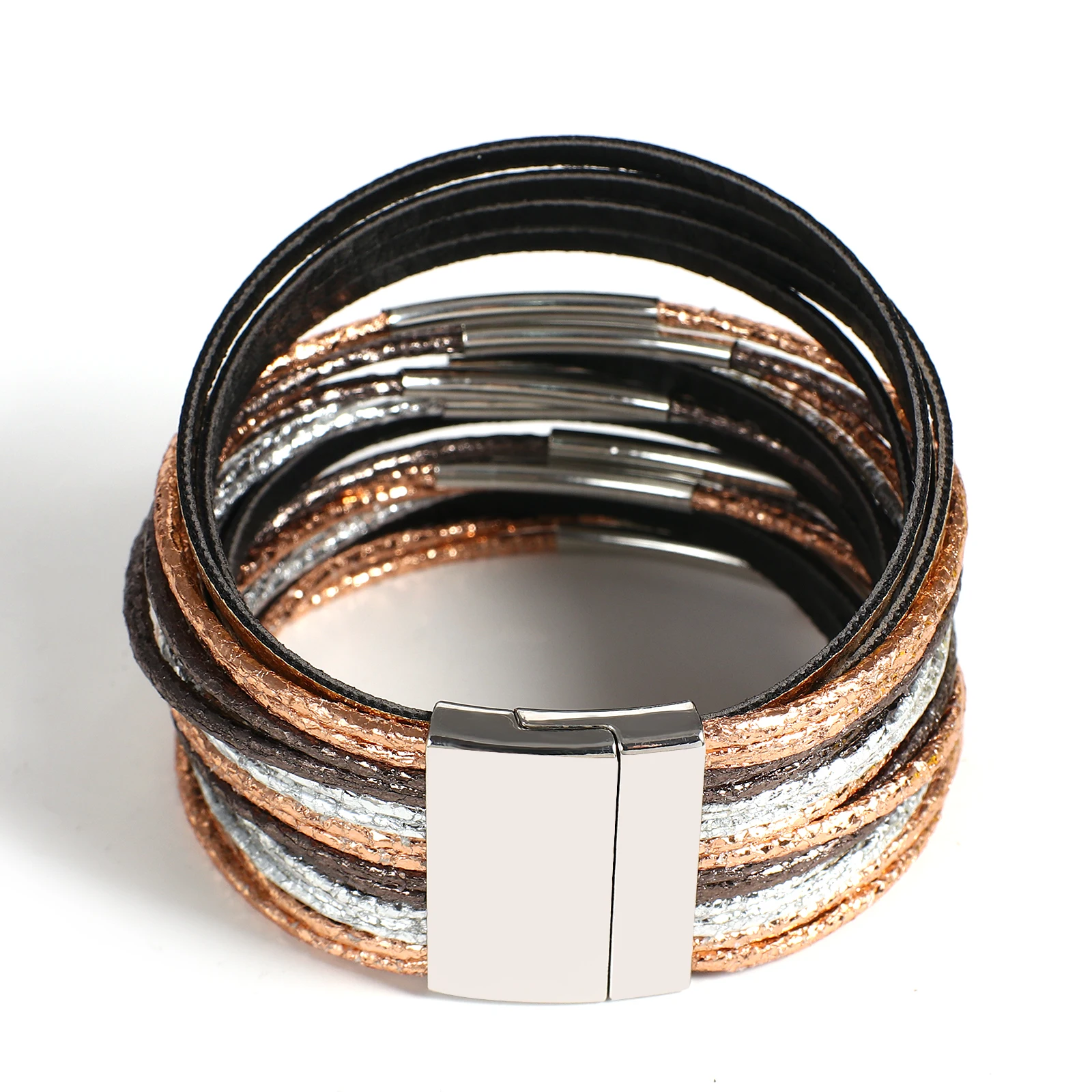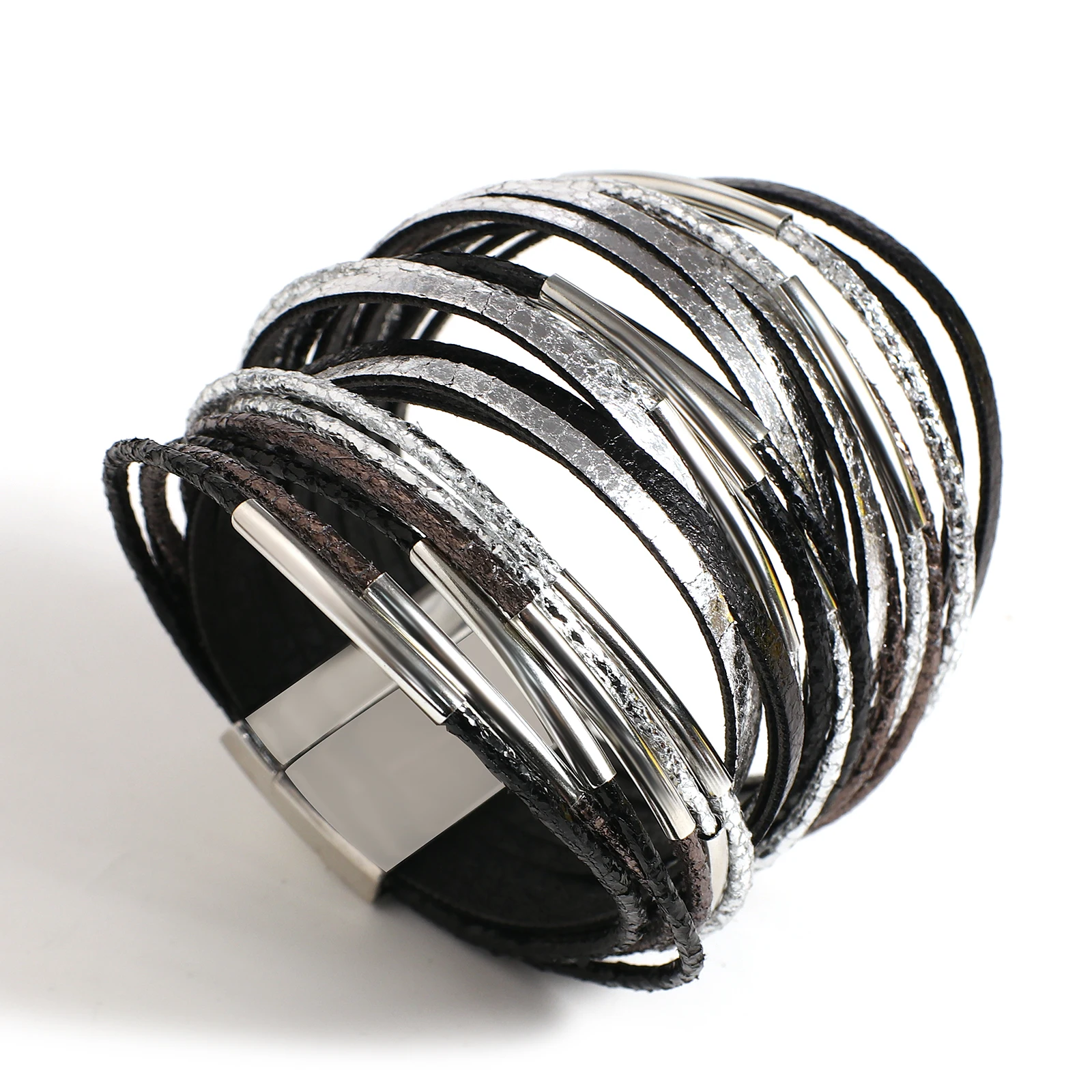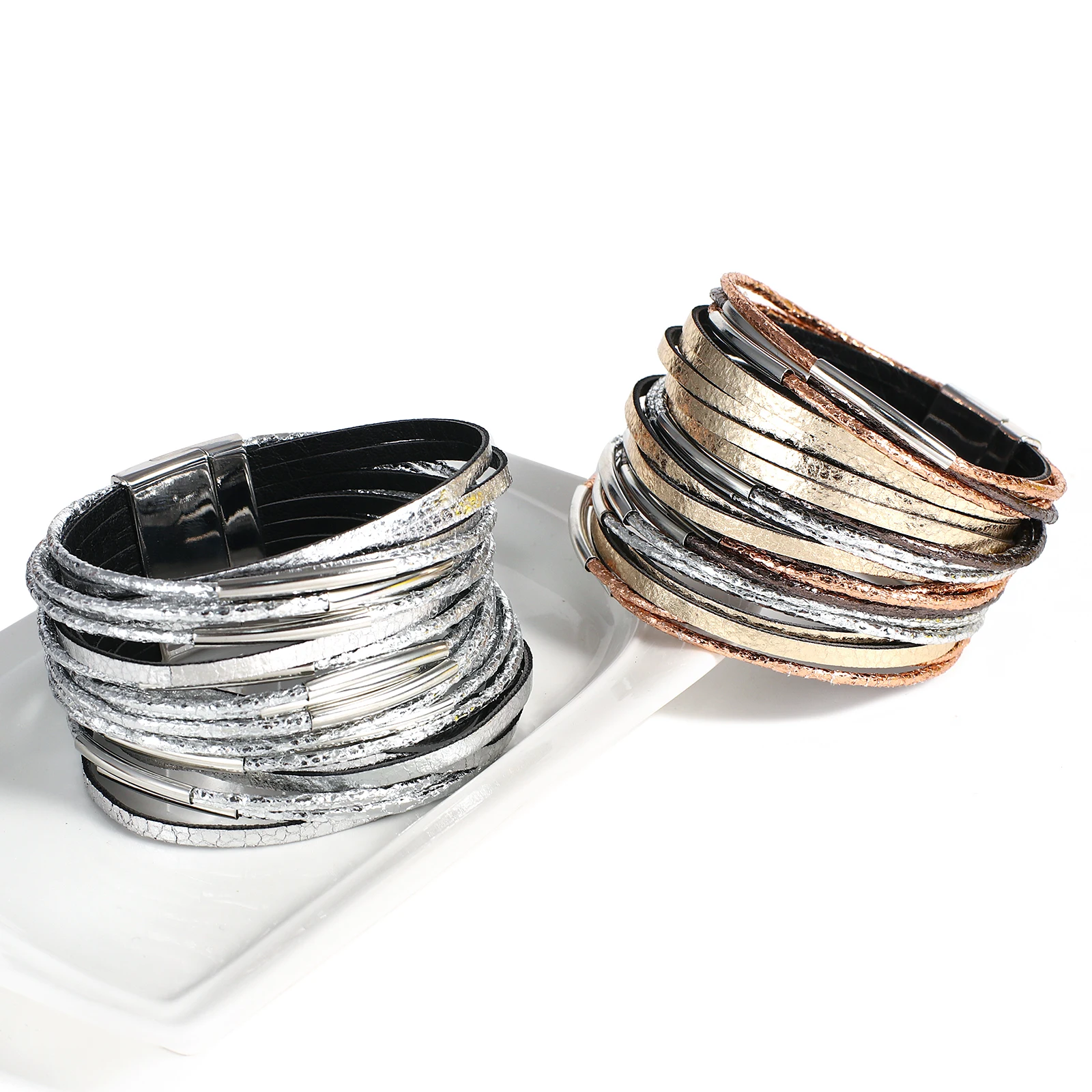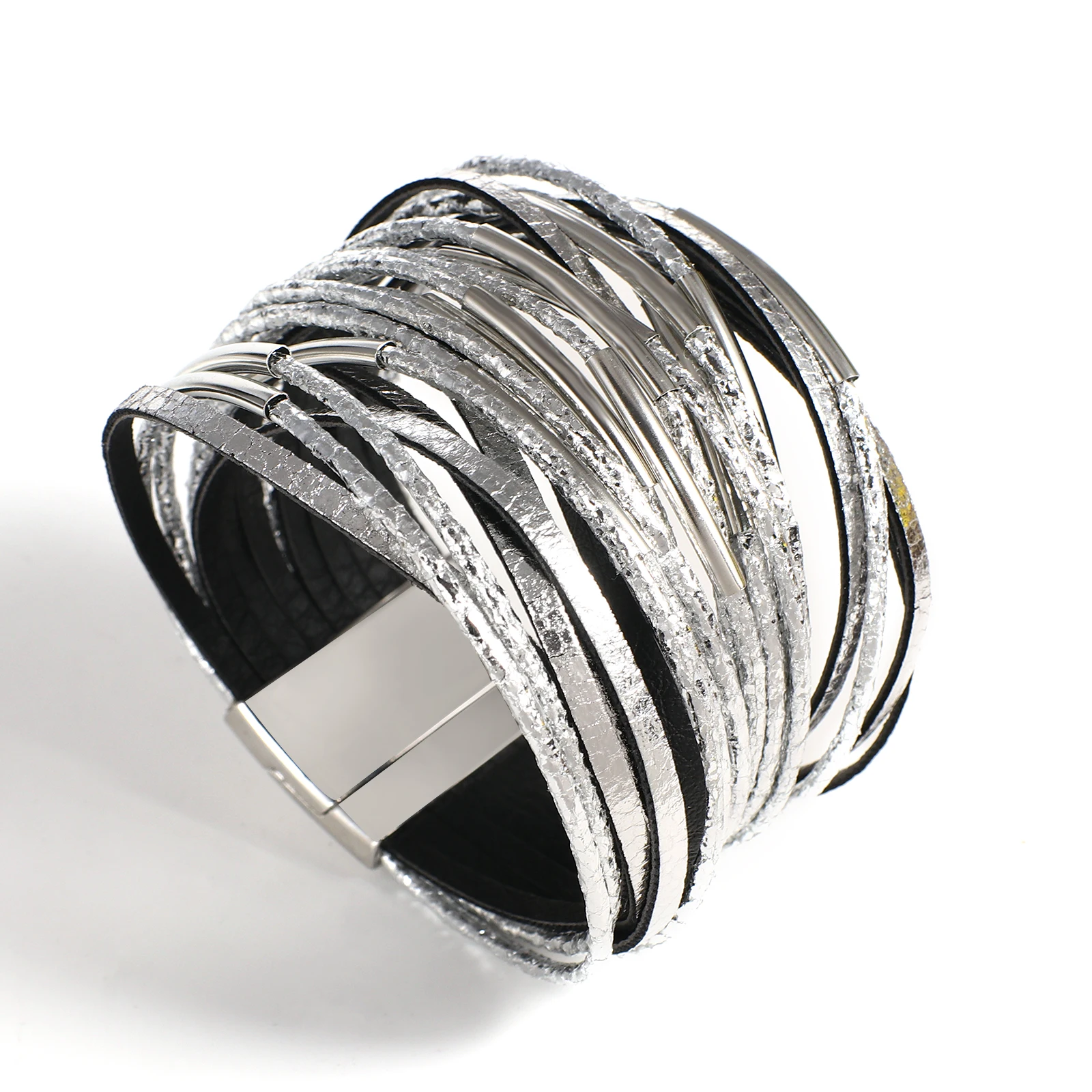 ALLYES Trendy Metal Tube Leather Bracelet for Women Men Chunky Glitter Filled Slim Multilayer Wrap Wide Bracelets Party Jewelry